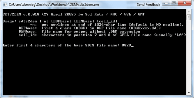 - Upon running the program you will be prompted to enter the first 4 characters of the SDTS file name. This is the first 4 characters of the DDF files, not the initial TAR.GZ file.