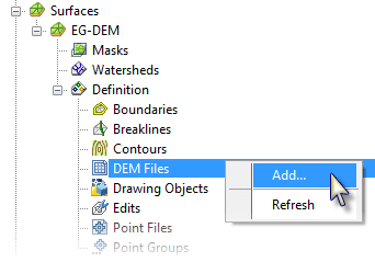 Note: I prefer naming my surface something like EG-DEM to make it’s origin very obvious to other team members. - Plus out your new surface in Prospector and navigate to the Definition>DEM Files node. Right-click on the DEM Files node and select Add…