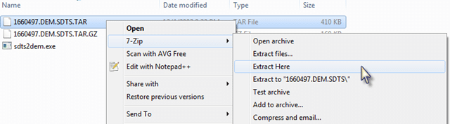 Downloads from the Geo Community website are provided as a TAR.GZ file. This is a compressed file format similar to a ZIP file. To get the DEM we must first unpack the file. While there’s an endless list of programs that can do this, I prefer 7-Zip (Free Download).